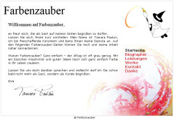 Farbenzauber ist die Homepage einer Künstlerin. Die Homepage bietet Informationen zur Künstlerin und ihrer Arbeit, sowie eine Kontaktmöglichkeit. Die Seiten wurden mit Templates umgesetzt, die Bilderansicht der Werke mit Hilfe einer Datenbank, damit die Künstlerin eigenständig weitere Bilder hochladen kann.